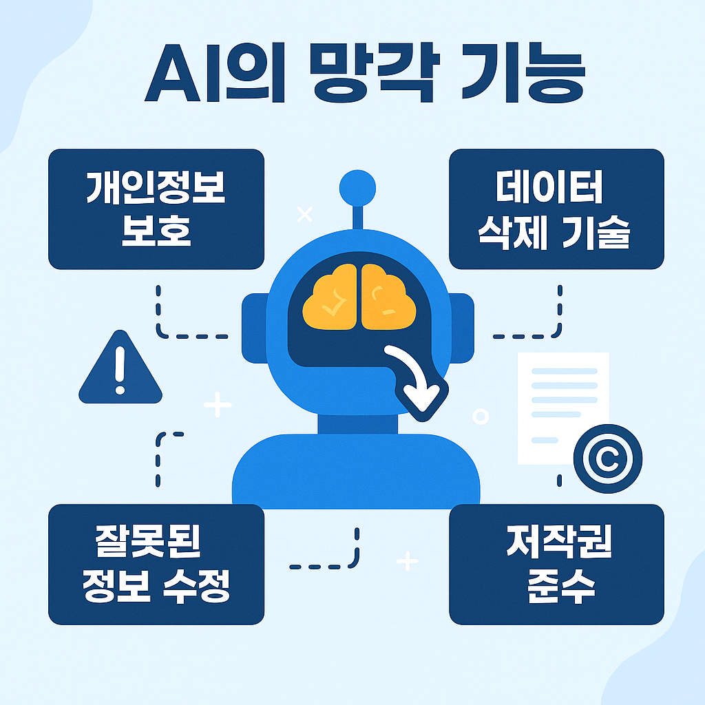 AI의 망각 기능은 인간의 기억과는 다릅니다. 인간은 시간이 지나면 자연스럽게 기억이 희미해지지만, AI는 한 번 학습한 데이터는 고정된 모델 파라미터 속에 남아 있습니다. 이를 제거하려면 특별한 재학습 과정이 필요합니다.